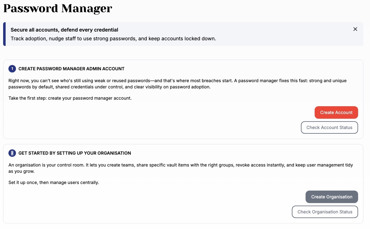 This guide walks you through activating your first admin account, creating your organisation, setting up collections, importing existing passwords, and inviting team members.