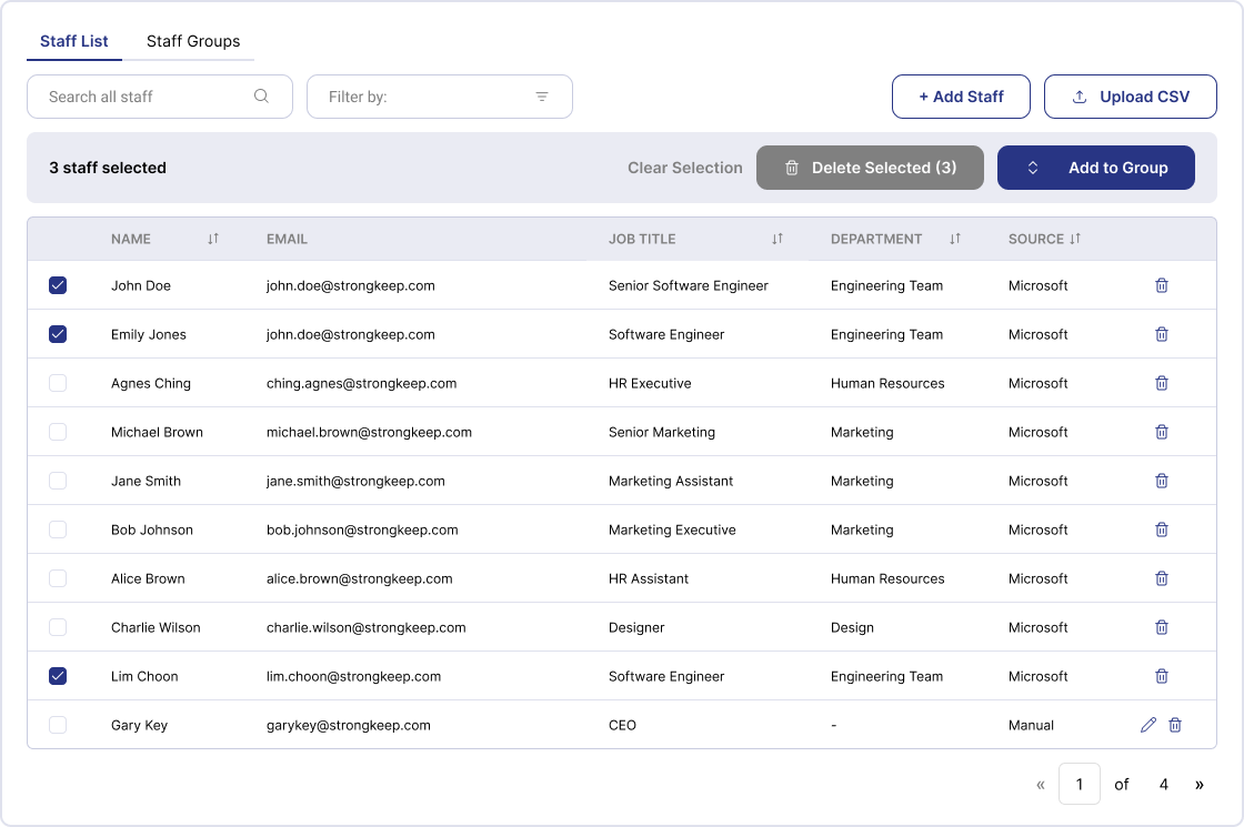 A staff list generated directly from the StrongKeep platform