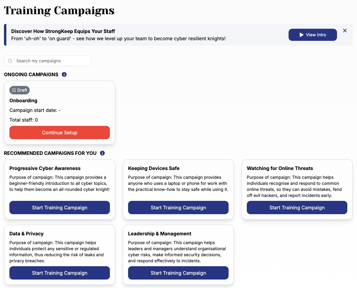 Training your staff is one of the simplest ways to reduce everyday cyber risks. StrongKeep helps you roll this out in minutes — from onboarding new hires to ongoing awareness training.